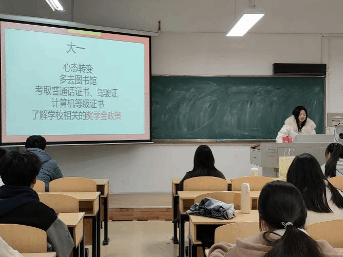 接下来是邹丽莎学姐,本科阶段的专业是国际经济与贸易。首先她强调了学习心态的转变,即从“要我学”到“我要学”,对此,学姐建议同学们应多去图书馆,感受图书馆中学习的氛围。然后她以大一到大四为时间节点,向同学们分别介绍各个阶段可以考取的证书,并通过相关文档资料进行说明,如大一可以考取普通话证书,大二可以考取英语四六级证书等。同时,她向同学们介绍了奖学金政策,建议大一期间可以多担任学生干部,参加学生组织。此外,她还推荐同学们参加不同类型的竞赛,以及大三所面临考研or就业的问题,并对该问题进行了充分的分析和提出自己的建议。