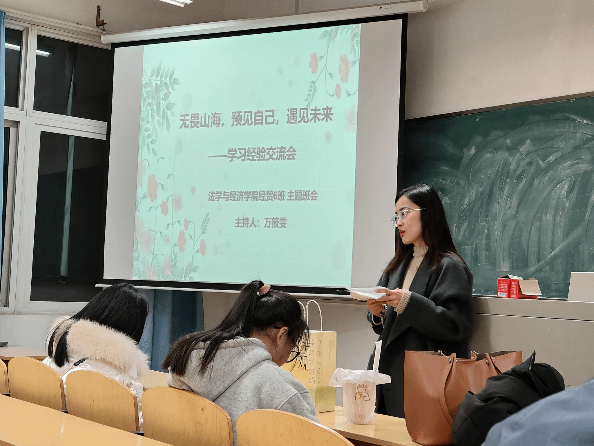本次班会由经贸2306班班主任万筱雯主持,在活动开始时,万筱雯老师以“大同学活是否和你想象的一样?”引入今天所要谈论的话题:学习经验交流,并邀请了两位学姐进行分享,她们是今年拔尖录取到应用经济学的研究生,目前处于研究生学习阶段。随后,学姐们逐一上台,分享了自己的学习经验。