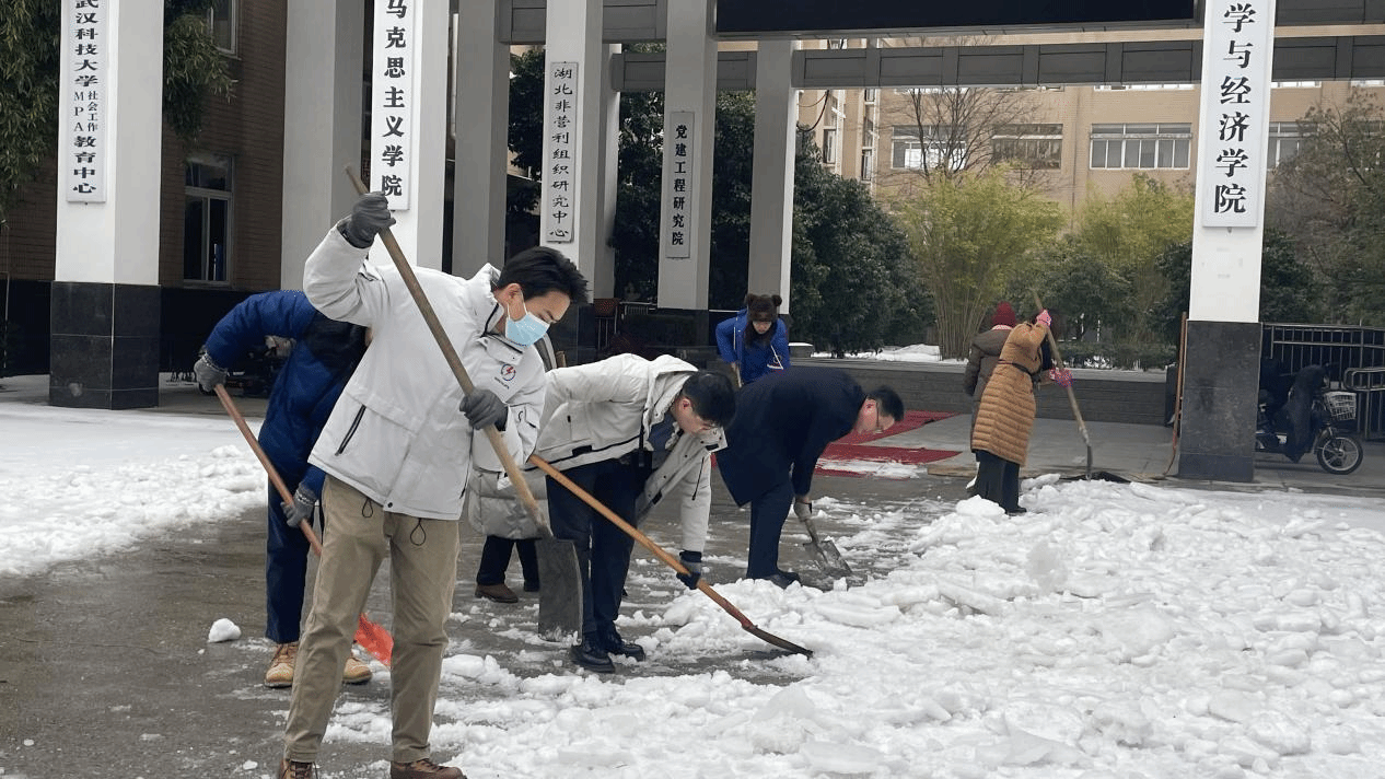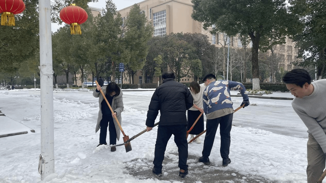 为确保师生工作学习、生活出行和校园安全,法学与经济学院党委根据学校统筹安排,积极行动、主动作为,第一时间组建党员突击队,学院领导班子率先垂范、带头行动,组织师生投身到清雪除冰行动中。2月23日,院党委书记杨彦、院长袁年兴统一部署,带领班子成员和党员教师迅速行动、清雪除冰,有效清理教四楼门前积雪。