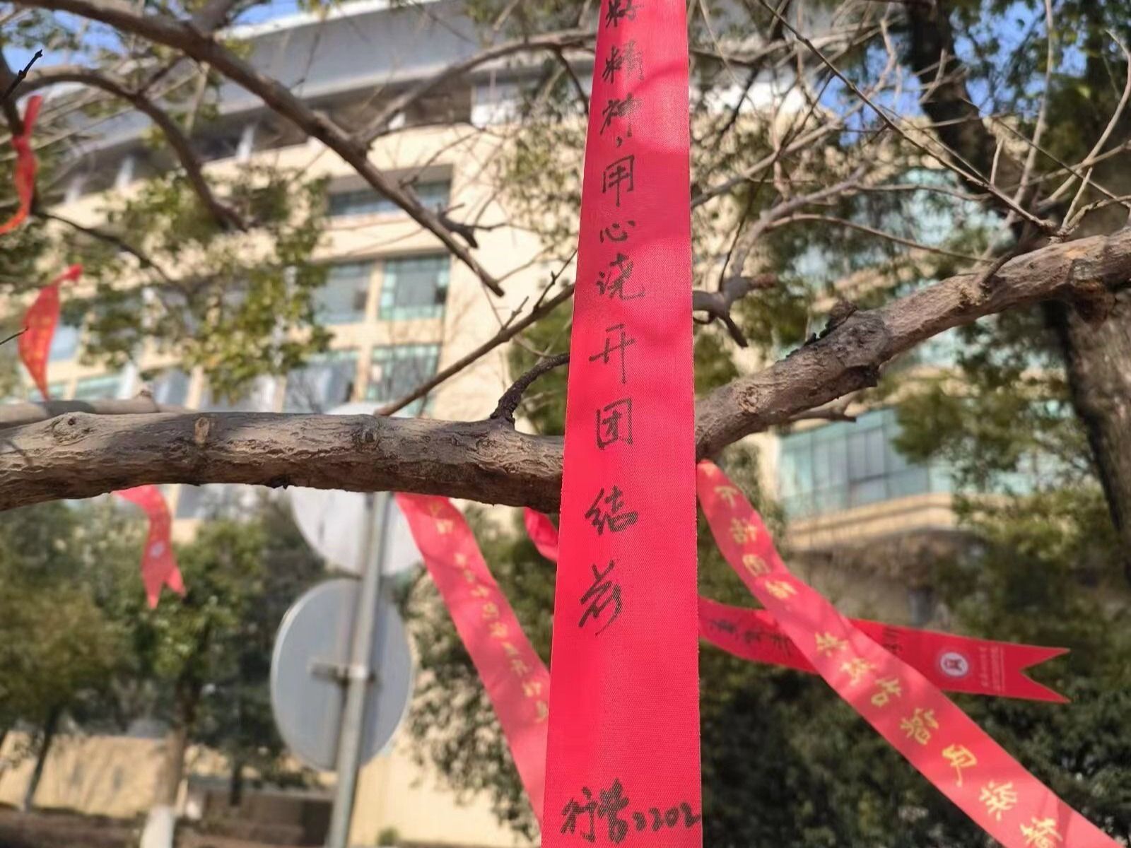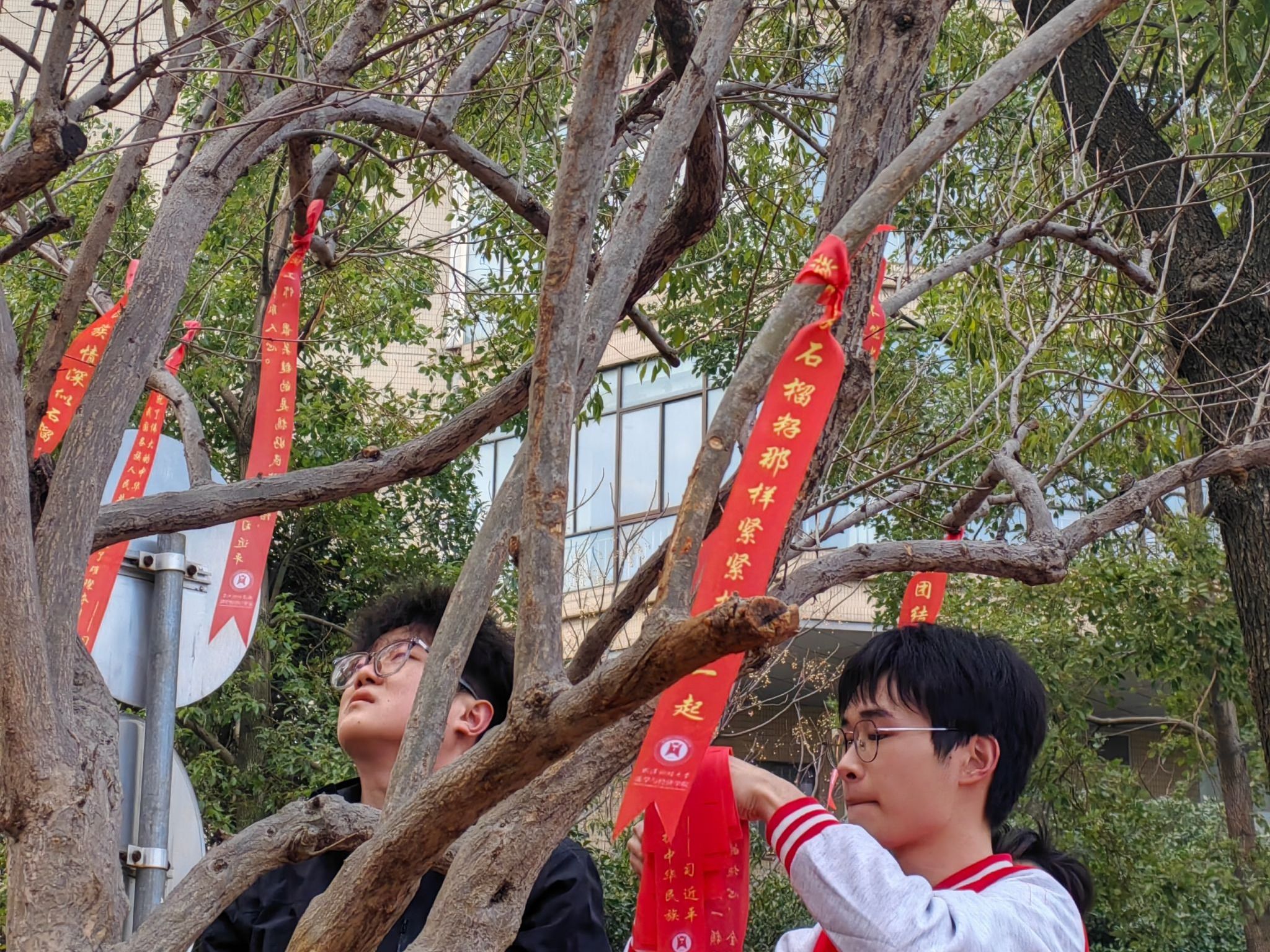“民族团结是我国各民族人民的生命线,中华民族共同体意识是民族团结之本”“各民族要相互了解、相互尊重、相互包容、相互欣赏、相互学习、相互帮助,像石榴籽那样紧紧抱在一起”“石榴树栽下,民族情更深”……石榴树下,研究基地提前准备了红绸带与便利贴,师生们将习总书记关于加强和改进民族工作的重要思想以及自己对铸牢中华民族共同体意识的理解、对民族团结进步的美好祝愿写在绸带上,然后将祝福彩带悬挂到石榴树上,共同表达对铸牢中华民族共同体意识的信心决心,营造民族团结的良好氛围。