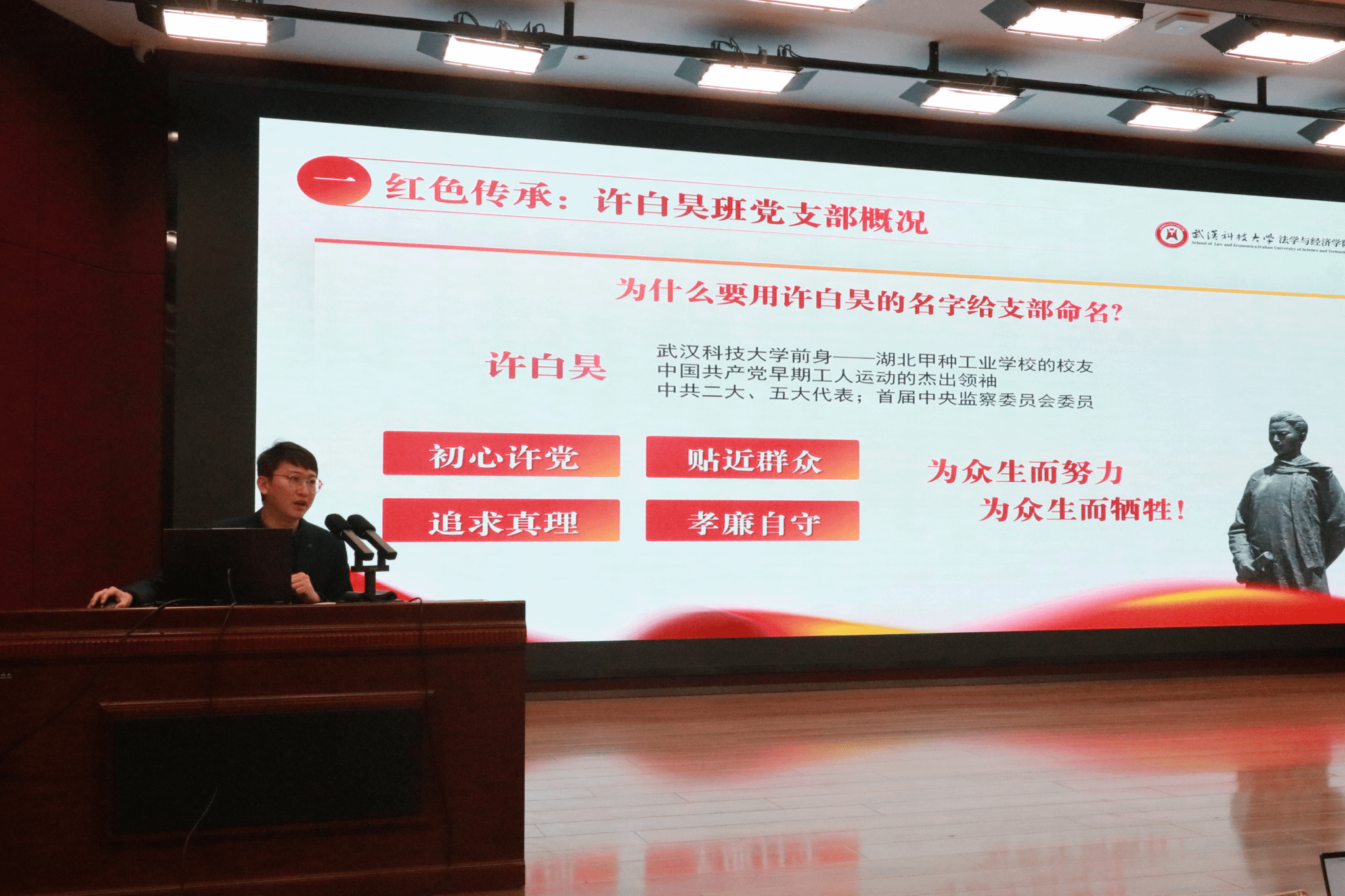 许白昊班学生党支部指导教师杜逸涵简要介绍了党支部基本情况以及“为什么用许白昊烈士的名字给支部命名”,并从党支部建设思路、重点举措及工作做法等方面,详细介绍了许白昊班党支部建设经验及成效。