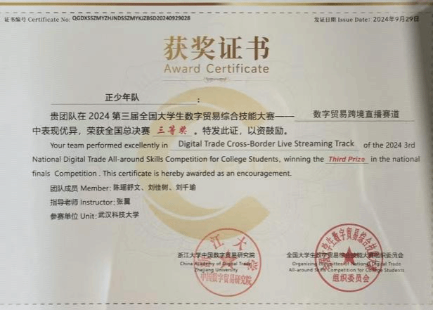 2024929日,第三届全国大学生数字贸易综合技能大赛全国总决赛颁奖典礼在浙江大学紫金港校区落下帷幕。米粒av 5名学生在贺尊和丁莹老师带领下参加了总决赛,并喜获佳绩。