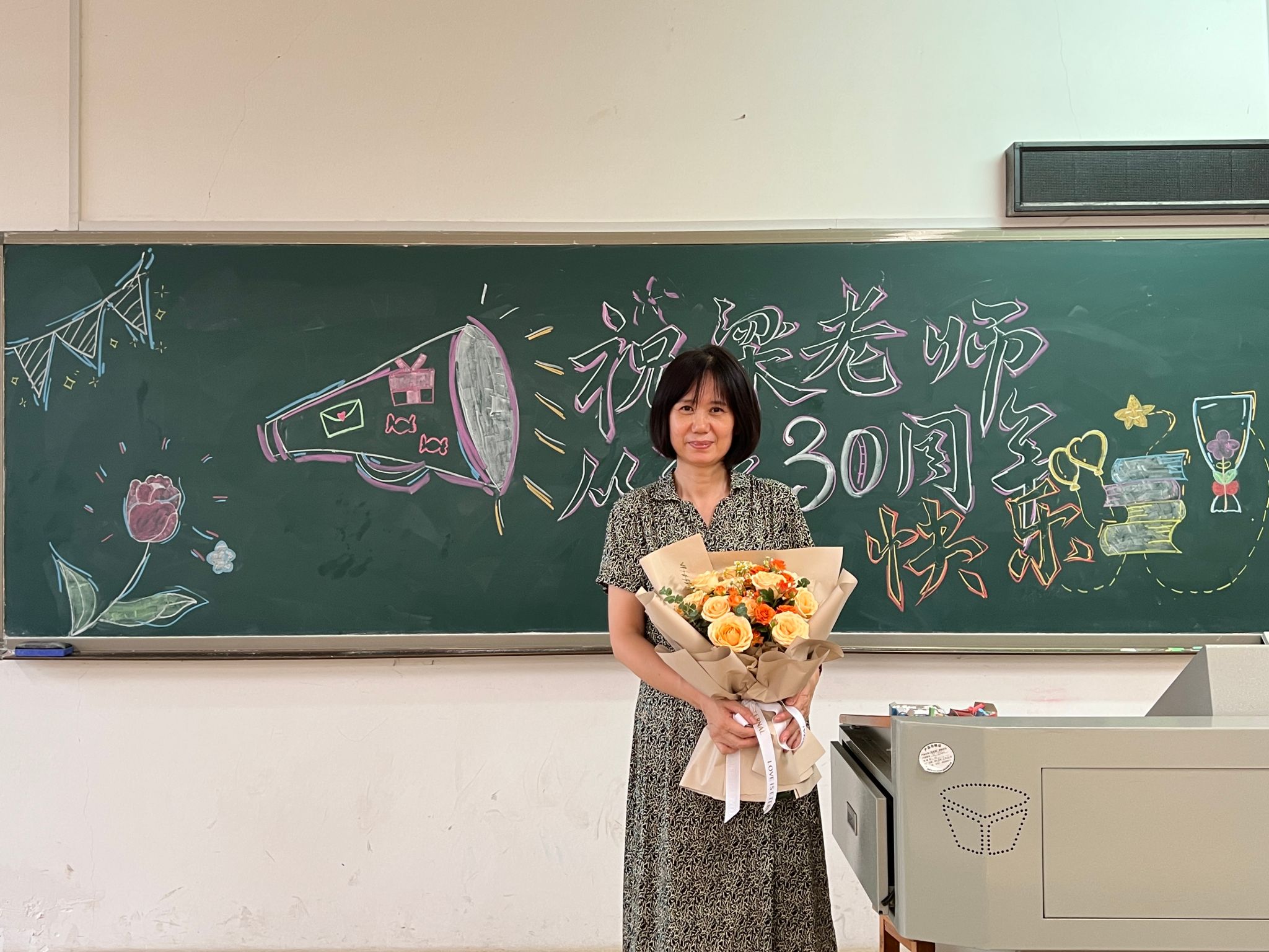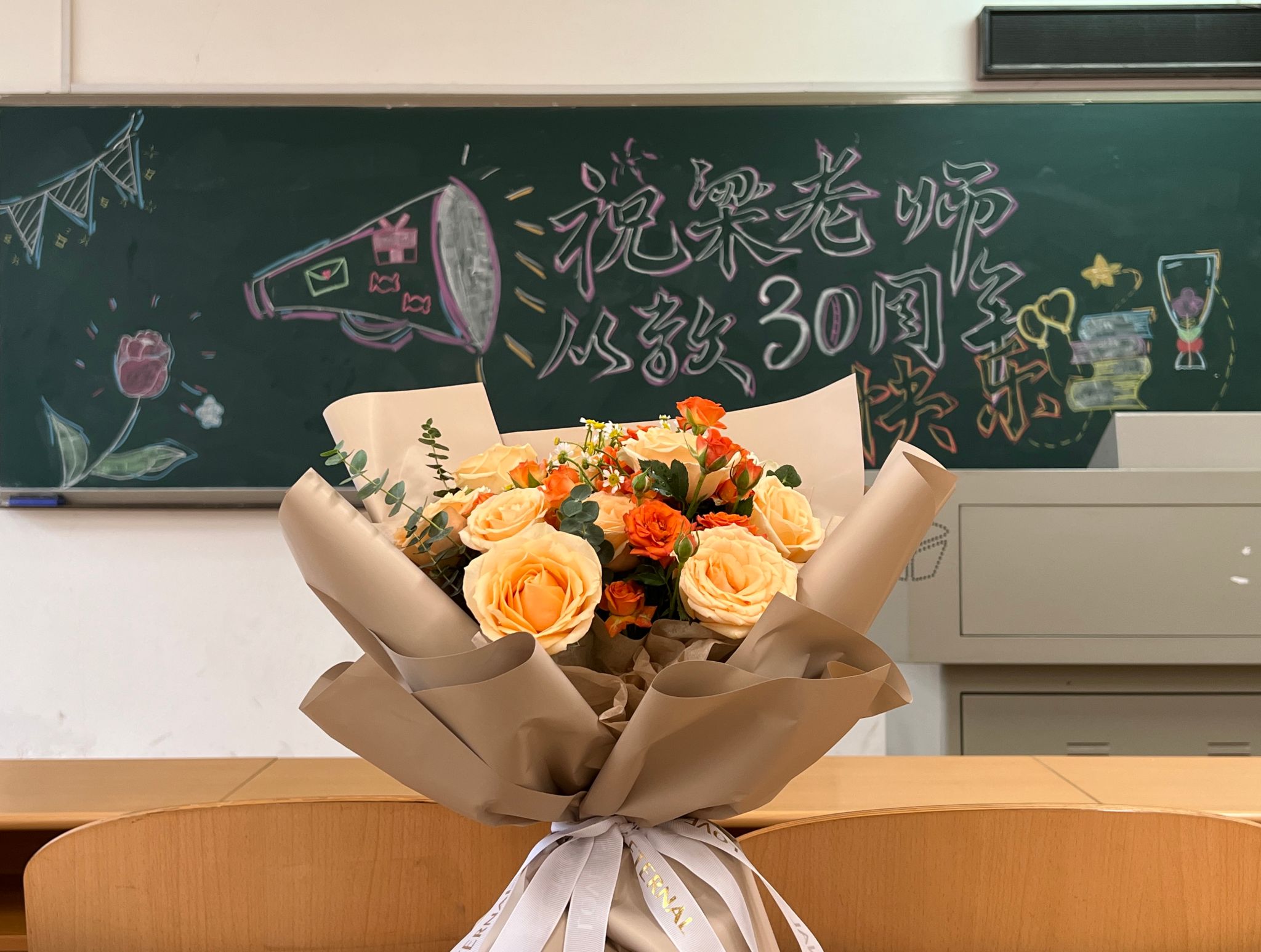 2022级辅导员王宇特地与法学2022级两个班的班长联系,向学生们提议为梁东新老师准备此次惊喜。法学2202班班长梅婷婷对此激动道:“在得知今天是梁东新老师从教三十周年纪念日后,我们便开始组织班上同学在下午民法学上课前画好黑板报并买好花束并提前向班上同学们说明此情况,和大家约定好在上课时给梁老师齐声送上祝福。”