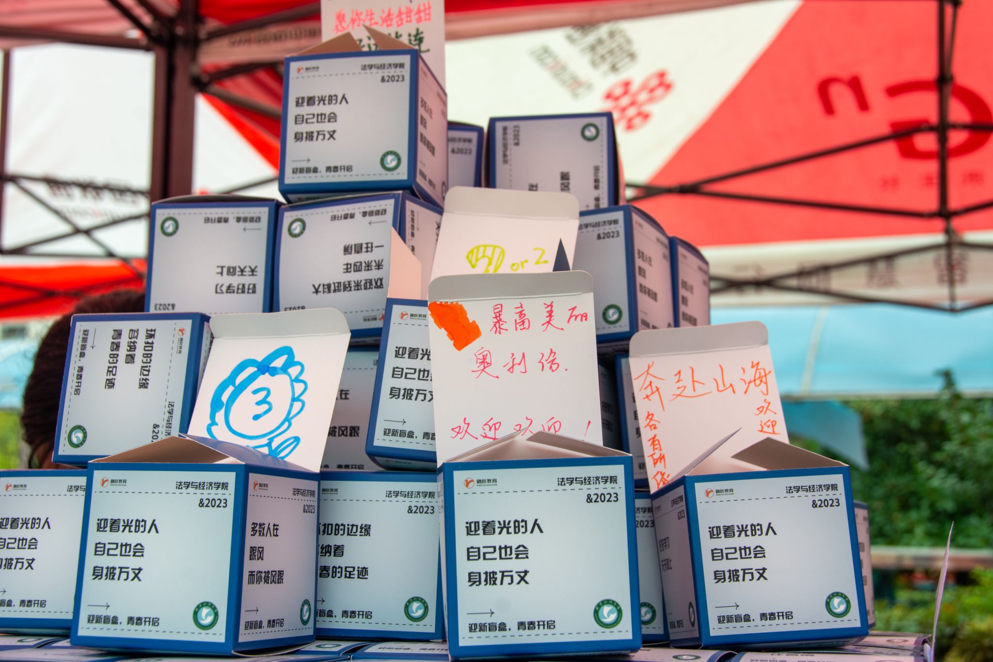2021级学生亲手写下的祝愿、寄语和定制小饰品,新生们可以通过在留言本上进行留言即可参与盲盒的抽取。