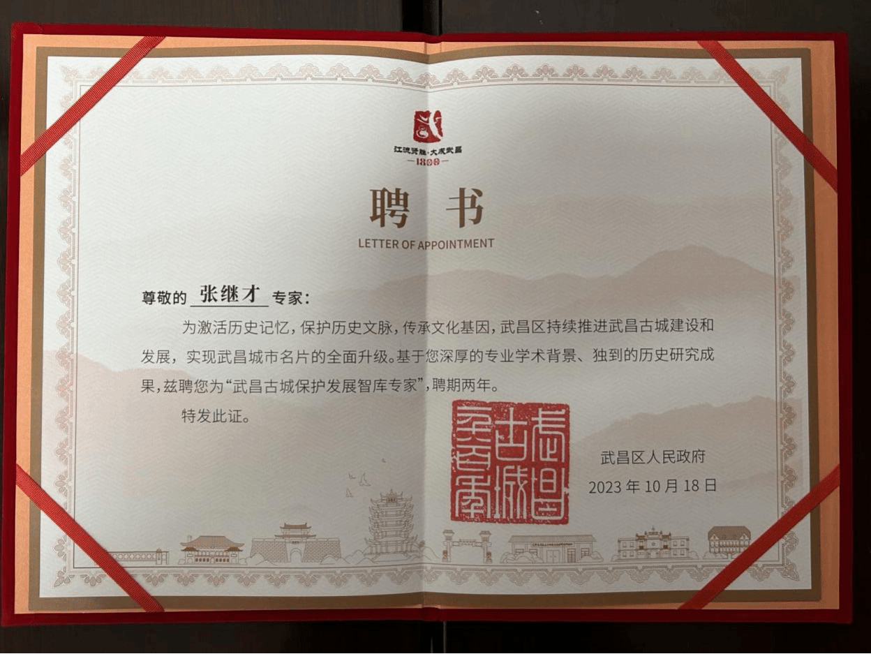 教授、博士生导师张继才因其深厚的专业学术背景、独到的历史研究成果,被聘为“武昌古城保护发展智库专家”,聘期两年。