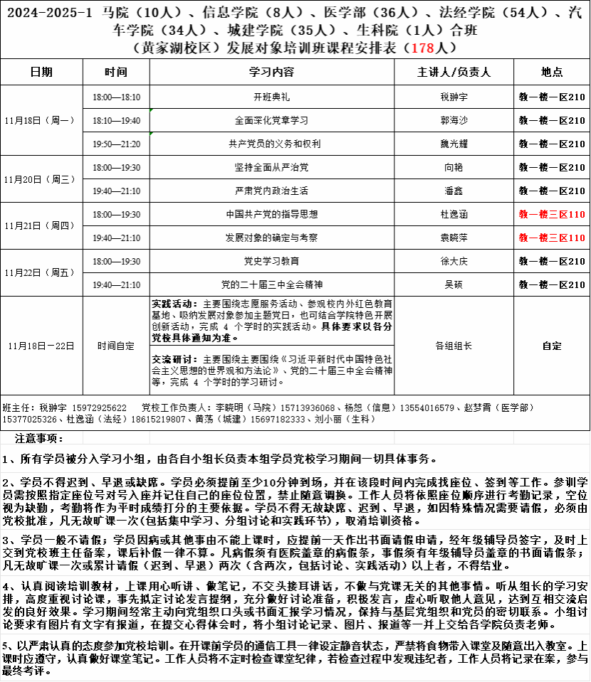 其中考勤统一签到;研讨、实践活动需8-10人自行组成小组于10月13日自行开展,并提交相关记录,相关记录请从学院网站党建工作-党校工作-“党课培训小组讨论、实践活动”中下载。